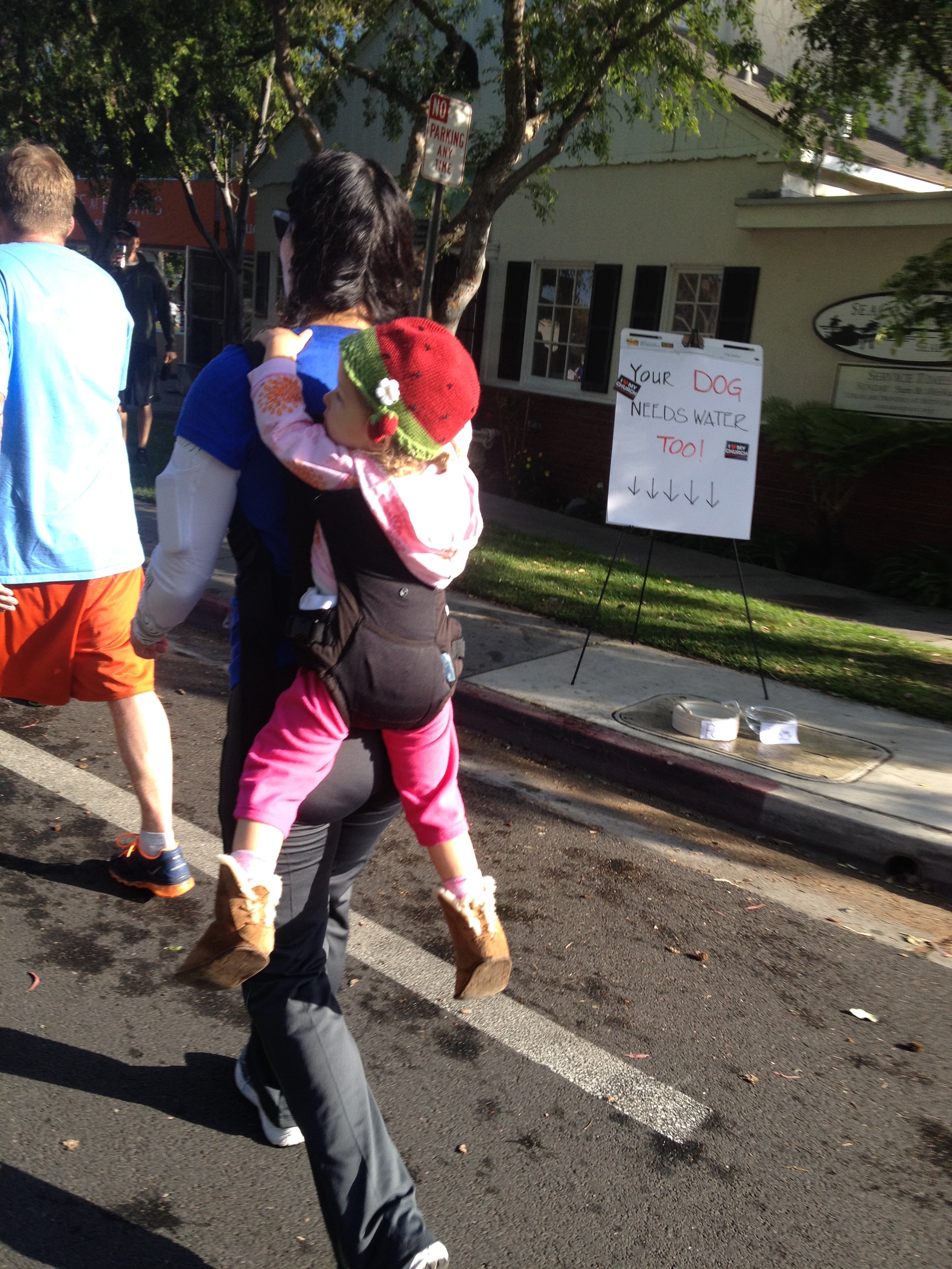 An interesting runner below… I was on my way to take a drink on mile 2 water bowl to the right when I suddenly see this little one hanging for her life on her humom‘s back! Her legs were swinging all over the place and they were trotting at a good pace. I may consider this for next year because then I will be able to see so much for from a higher view point! I wonder if my humom will go for this…