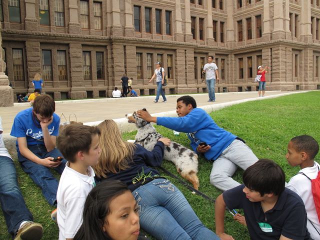 Instead, our friend Laura took us all around town and we ended up at a huge park in the city they call the Capitol of Austin.  While I thought that the most fun was going to be playing in that park, it turns out that there were lots of new friends that I met there.  They were visiting from their schools to learn about all the history that dates back to 1876. They were really nice and did not judge me for my bad haircut!