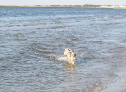I played on the beach for a good hour with some new friends. This is Missy, Choco and Bentley. We chased each other and several balls until they had to go in for dinner.
